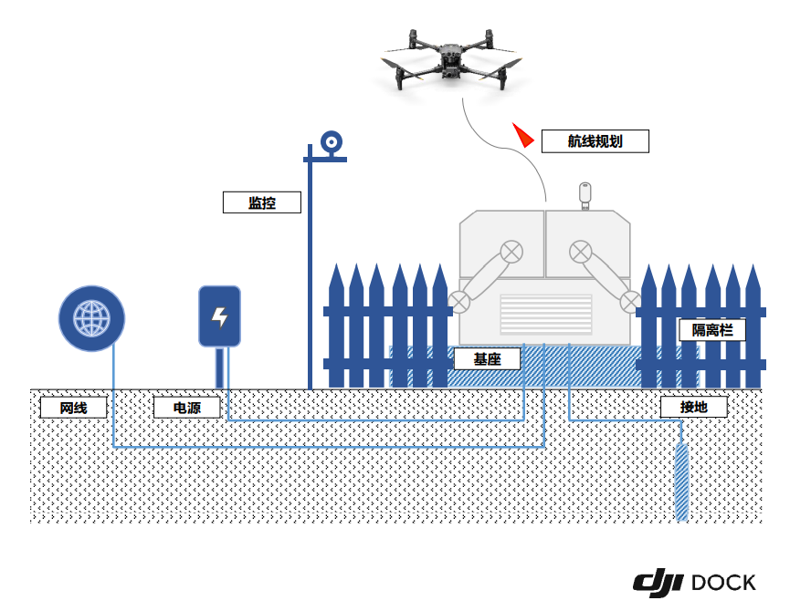 大翼航空为自动机场的软硬件系统安装组建了全新的服务团队。从机场前期的勘察选址、地基预埋和接地、供电供网的提供和接入标准,直到安装完成后机场和系统的测试联调、试飞和自动化巡检路线规划,都严格按照大疆行业机场的规范,所有服务人员都经过大疆机场专业的培训并通过考核后上岗。