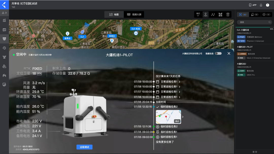 大疆机场+风筝线KITE BEAM无人机云管理系统,不仅实现了整套系统安装部署后,现场无需人员值守,通过远程即能完成作业。风筝线系统配置大疆机场后,可定时定点,自动完成巡视工作,还可以接入客户拥有的其他主流品牌、型号的无人机,一站式为巡检场景带来创新应用和效率提升,助力实时全态势感知数字化平台建设。