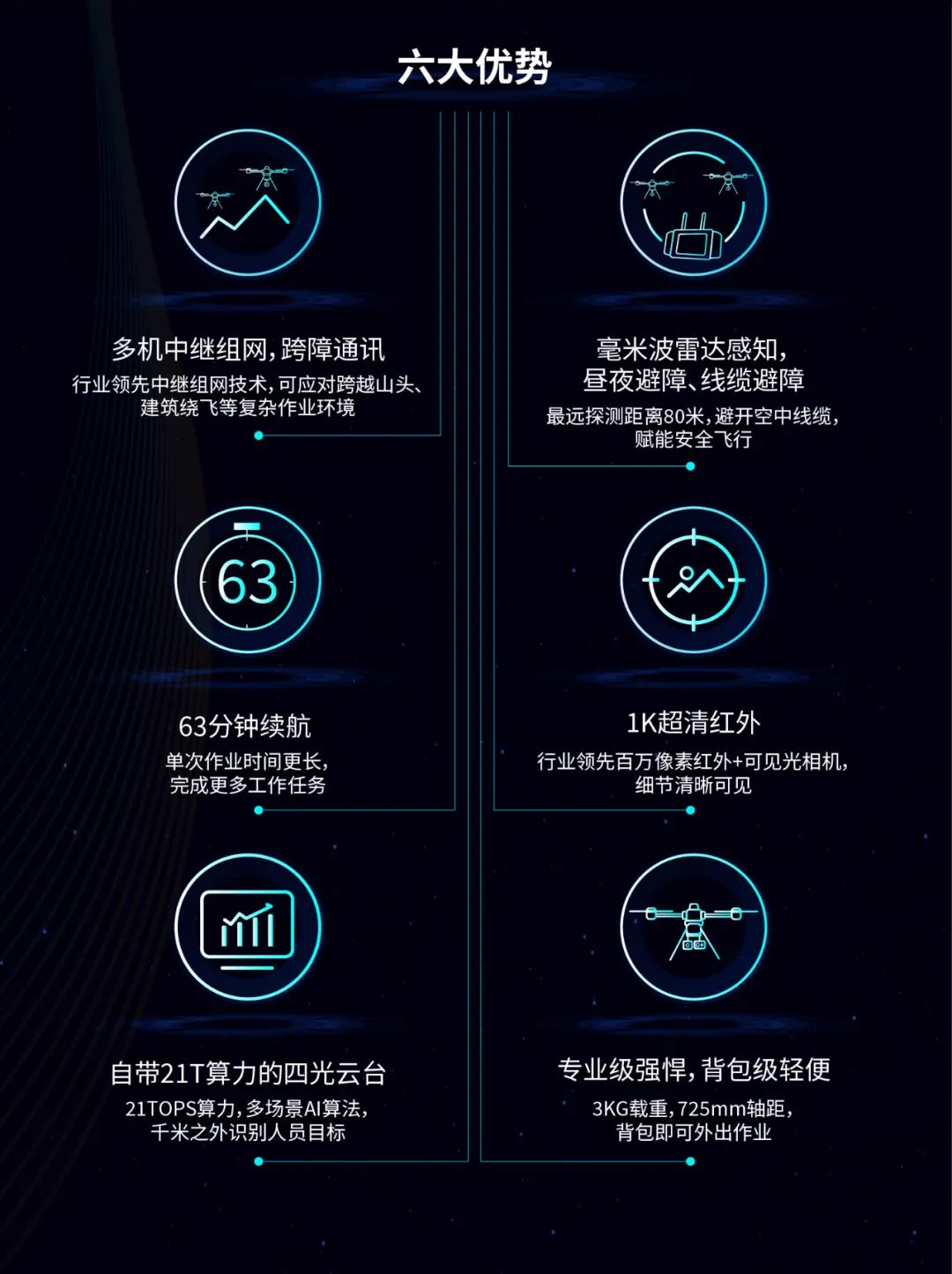 S400无人机单架次航时高达63分钟,可搭载全新1K红外云台和8K可见光云台,兼具航程与拍摄精细度,全面提升巡检工具性能。