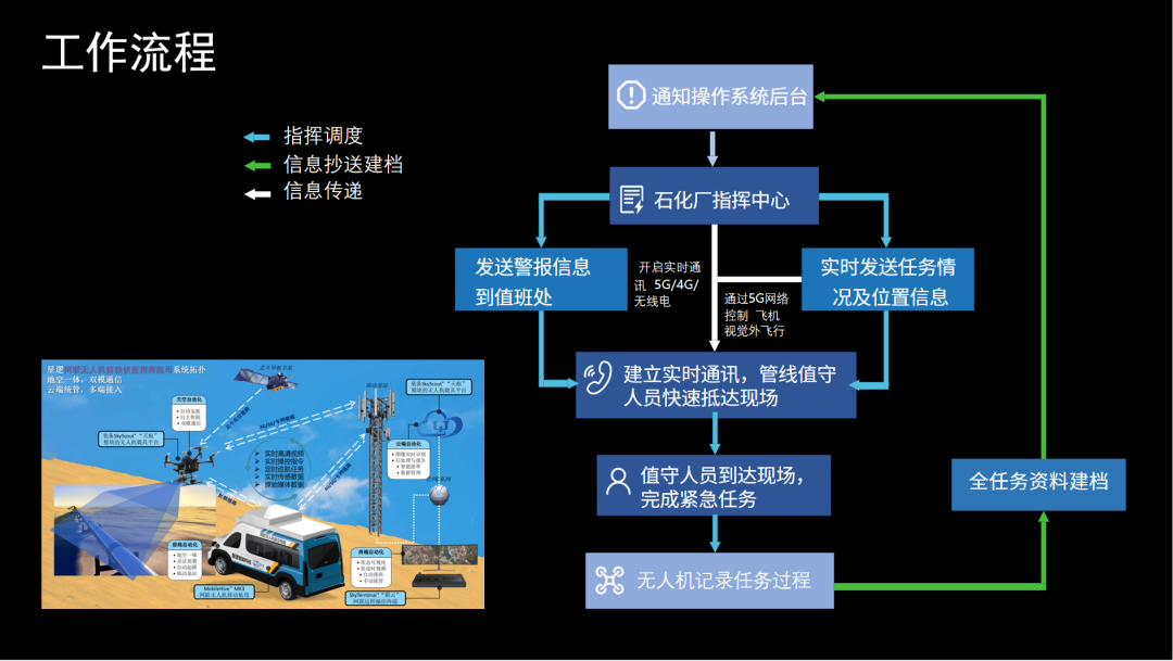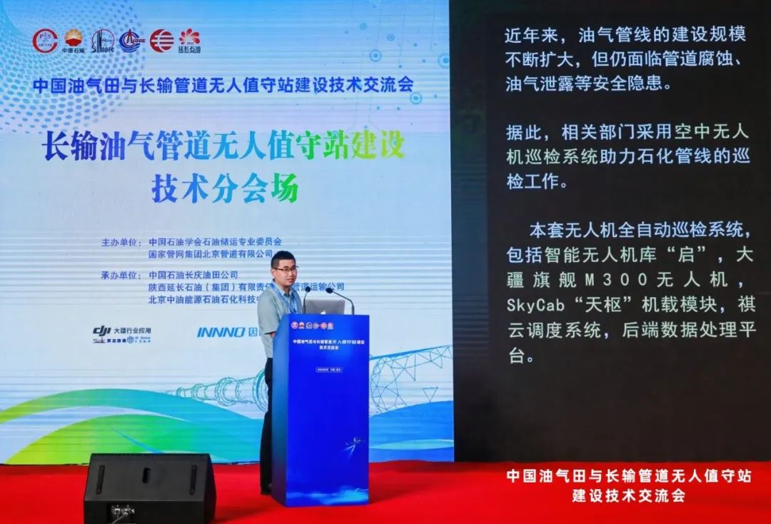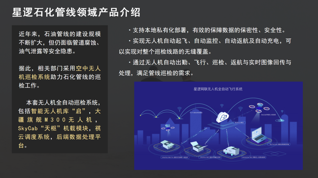 他以石油管线巡检现状为切入口,介绍了星逻智能的石油管线智能值守系统,包括智能无人机库“启”,大疆旗舰M300无人机,SkyCab“天斗”机载模块,祺云调度系统,后端数据处理平台。