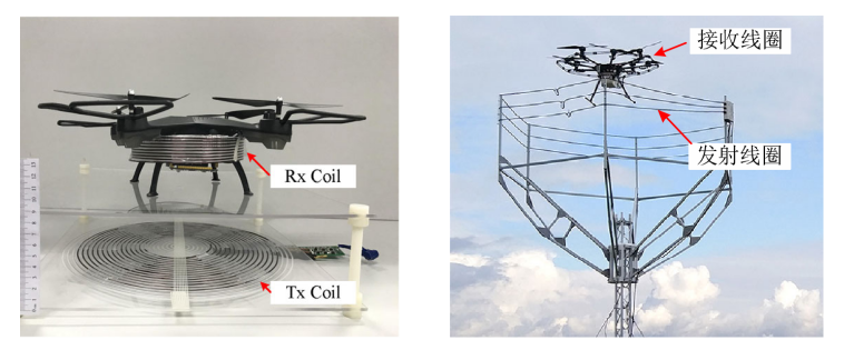 无线感应充电技术分为磁感应式充电技术和磁共振式充电技术,磁感应式充电技术通过接近发射线圈的方式感应其中的电流变化,从而实现无线充电,磁感应方式充电原理简单,但其感应距离仅有数厘米。而磁共振式充电技术在磁感应技术的基础上要求发射线圈和接受线圈具有相同的共振频率,充电感应距离可达数米。图(a)所示为zhou等设计的一种小型磁感应技术无人机充电装置,该装置能够在10cm的距离内保持高于93.6%的传输效率,但其传输功率较小,无人机需要实现高精度自主降落功能。图(b)为Global Energy Transmission(GET)公司研发的大型无线充电装置,一架电动工业级无人机只需在电网上盘旋6分钟就能充满电,无人机充满点后,可以一直飞行到电池快要用尽的时候,然后再进行充电,如此反复,不用着陆或连接电缆。
