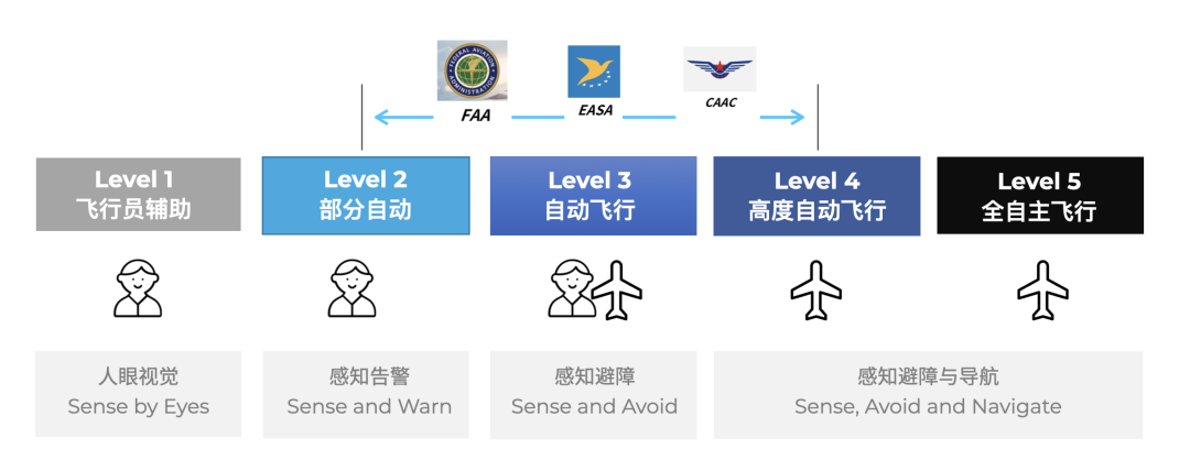 eVTOL飞机的智能化分级,和汽车自动驾驶分级很相似,是一个从辅助驾驶、半自动飞行再到最终的全自主飞行的阶梯式分级。欧洲EASA与美国FAA的分级方式稍有差异,但整体思路比较接近。当前eVTOL领域的发展基本在Level 2-Level 4阶段,国外大部分的头部企业还是选择了以自动化飞行为主,计算机辅助决策的模式,即Level 2阶段。FAA与EASA基本上也是支持这种模式,而中国局方此前新出台的面向亿航的专用适航认证规范则是第一次将无人驾驶载人飞行器的远程操控放进了适航的专属条例里,是中国局方(CAAC)的一次尝试与创新。
