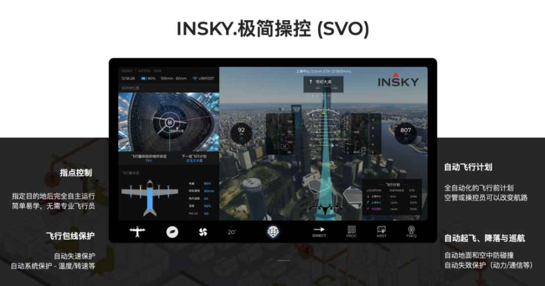 从人机交互界面看,极简操控模式(SVO)相比传统飞行器操控更加直观、简单。但从算法层面或是飞行控制角度看,SVO对于eVTOL飞行包线提出了更高的要求,特别是在飞行包线保护和过渡态自动飞行方面,需要功能更加强大的飞行控制系统。从起飞前的自动化飞行计划,到空管员远程接入改变航线,将逐步形成一个全自动化飞行的方式。