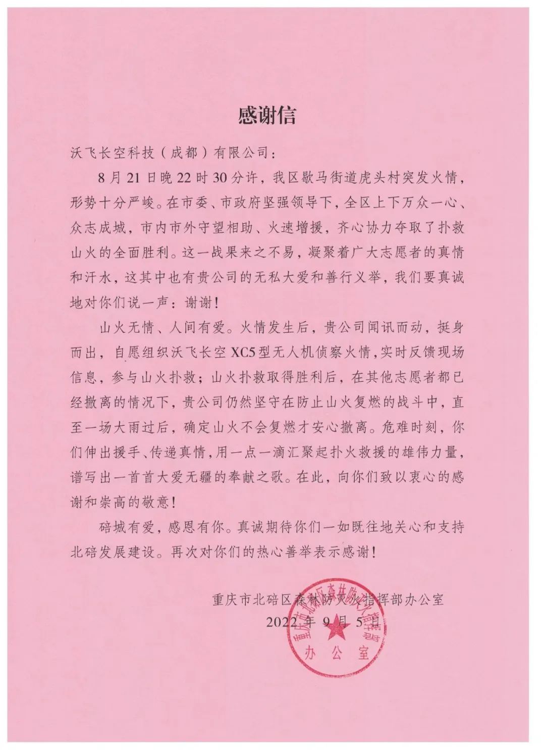 成都疫情管控刚结束,沃飞长空正当忙于全面复工复产,此时收到了一封来自重庆市北碚区的感谢信。天灾无情,人间有爱,每一次灾情发生时都牵动着全国人民的心,沃飞长空也一直坚持走在救灾防灾的第一线。