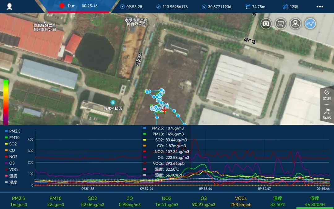 此次为期七天的环境检测工作中,普宙科技对孝感市金凤凰、金红叶、维达、丽邦、中盐东兴、大发门业等8家高架源企业和六合、东山头、车站、银湖等4个中心城区不同类别工业园及产业集群开展空中大气污染物监测。