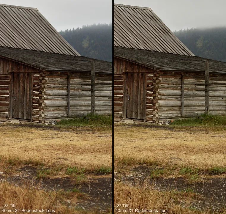 左侧的照片使用f/11光圈拍摄,焦点在谷仓上,镜头没有俯仰。它是一个标准的焦平面,和其他所有标准镜头一样,效果也相当不错,但是问题是远处的山脉细节不太清晰…