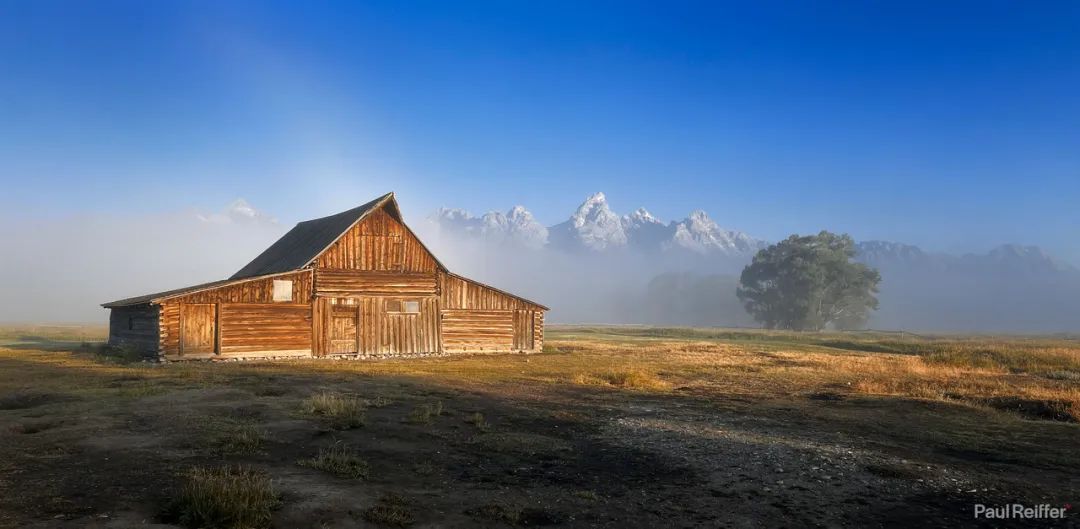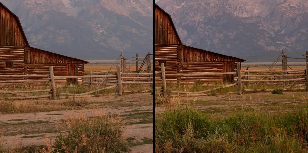另一边,右侧图像的效果,和John Moulton Homestead效果一样,从前景到背景画面都是完全清晰,光圈相同,几乎没有衍射,但它是通过将镜头向下俯仰朝向大地。