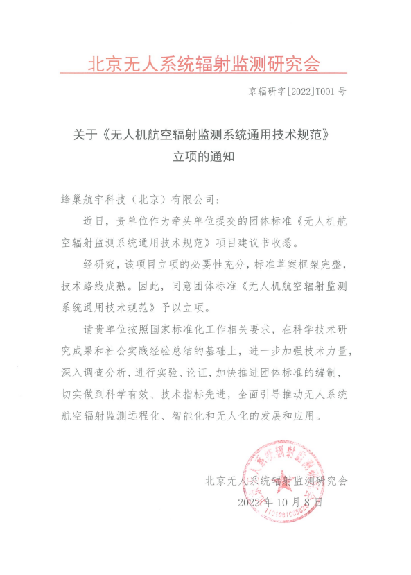 2022年10月8日,以蜂巢航宇牵头的《无人机航空辐射监测系统通用技术规范》团体标准正式立项。