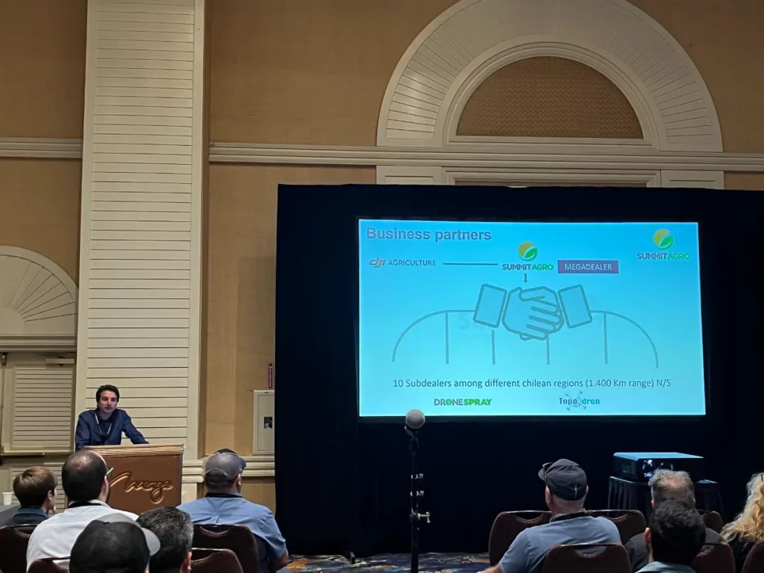 在大疆 AirWorks 2022 开幕前夕,大疆农业在美国拉斯维加斯举办美洲代理商大会。来自美洲十多个国家的近 100 个伙伴聚集在一起交流心得、分享经验,共同推动大疆农业全球化发展。