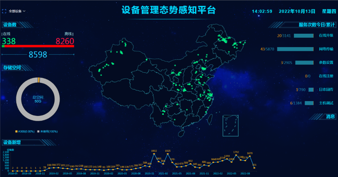 多维度记录平台设备的状态,对旗下设备的运行状态、使用情况等一目了然。包括:设备在线情况、实时上下线情况、运维记录、网盘使用情况、设备增长趋势等等。