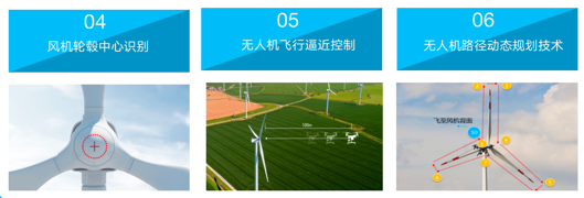 在无人机全自主风机巡检系统控制下,只需发送起飞指令,无人机可完成巡检任务路径自主规划,通过风机航向识别、风机桨叶角度识别找准风机轮毂中心完成识别,借助无人机飞行逼近控制,无人机可飞近风机中心轮毂,并依据已采集的数据通过无人机路径动态规划技术完成自动巡检过程。