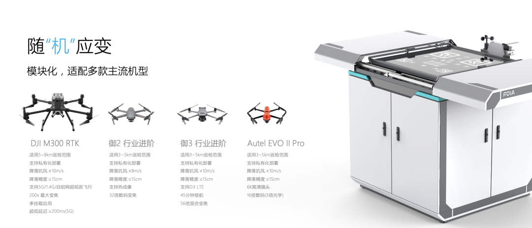 作为复亚智能首个适配多款工业无人机的轻量化充电机场,A30EC目前已打通DJI M300 RTK、DJI Mavic 2/3行业版、Autel EVO II Pro 等多款主流工业无人机。A30EC机身标配一体化通信基站(可选配独立通讯基站),机场舱门闭合尺寸为1.58 x 1.58 x 1.59m,重量低于900kg。
