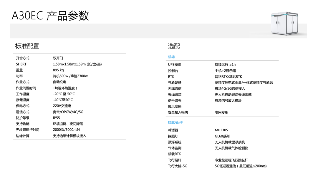 本次发布的A30EC轻量化无人机机场将进一步降低部署选址要求和施工难度,带来更好的行业部署适应能力。