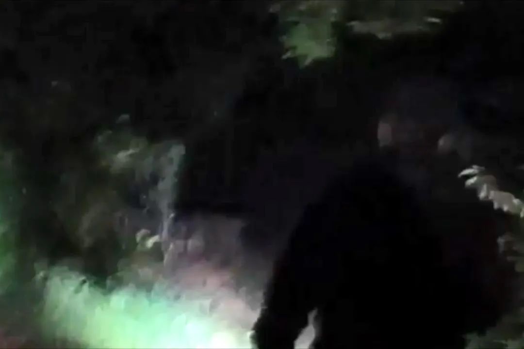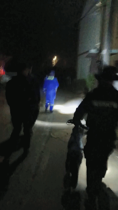 夜晚的山林漆黑一片,搜救队员依靠手电筒光及无人机空中照明指引赶往热源点。