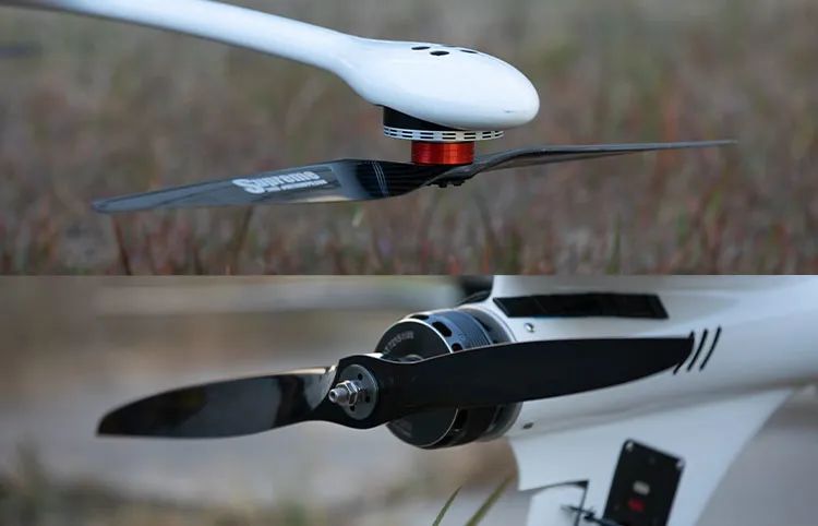 垂直起降和尾推采用了碳纤维螺旋桨,动平衡性能更好,共振更小,效率更高。