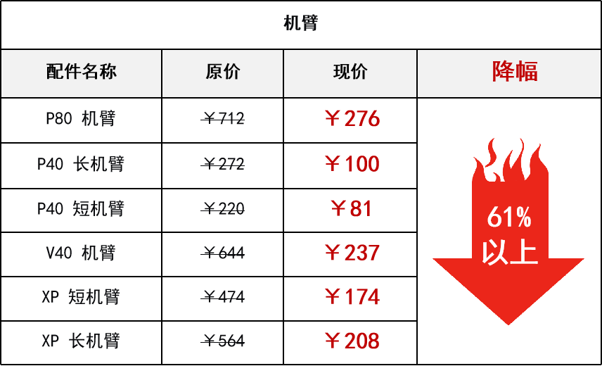 我们依然根据三大类配件来看降价幅度(*如果不清楚三大类配件的,可点击蓝字标题查看:一篇分清楚:电子件、结构件、耗损件)。上方列举的是平均降价幅度,部分配件降价幅度甚至达到了 50%!