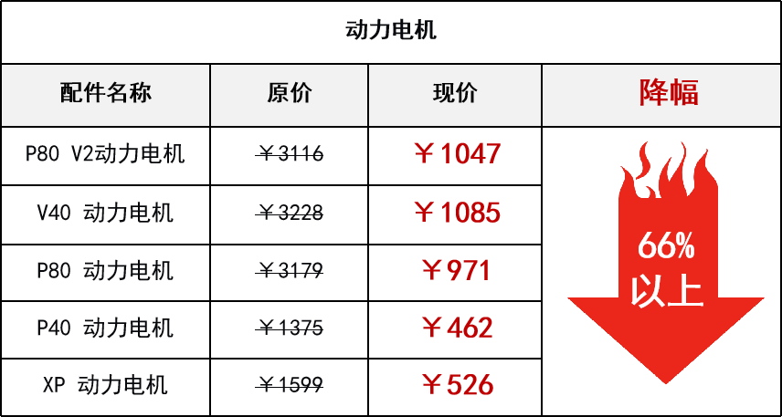 比如说动力电机,22 年的官方售价是 ¥3280,而降价后,您只需要花 ¥1798 就能买到。下面我们马上来看看常用配件的直观降价情况: