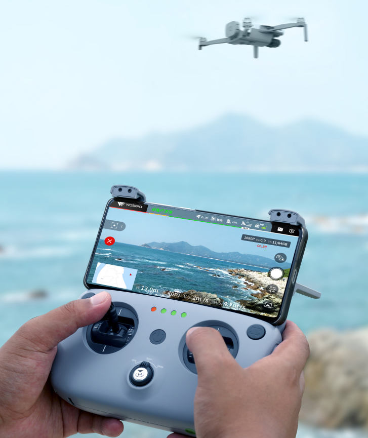 便携折叠遥控器:适配WKRC-H9遥控器,该遥控器采用折叠设计,支持手机实时监控,使用方便,双摇杆+双拨轮设计适合精细操作,驾驭飞行。