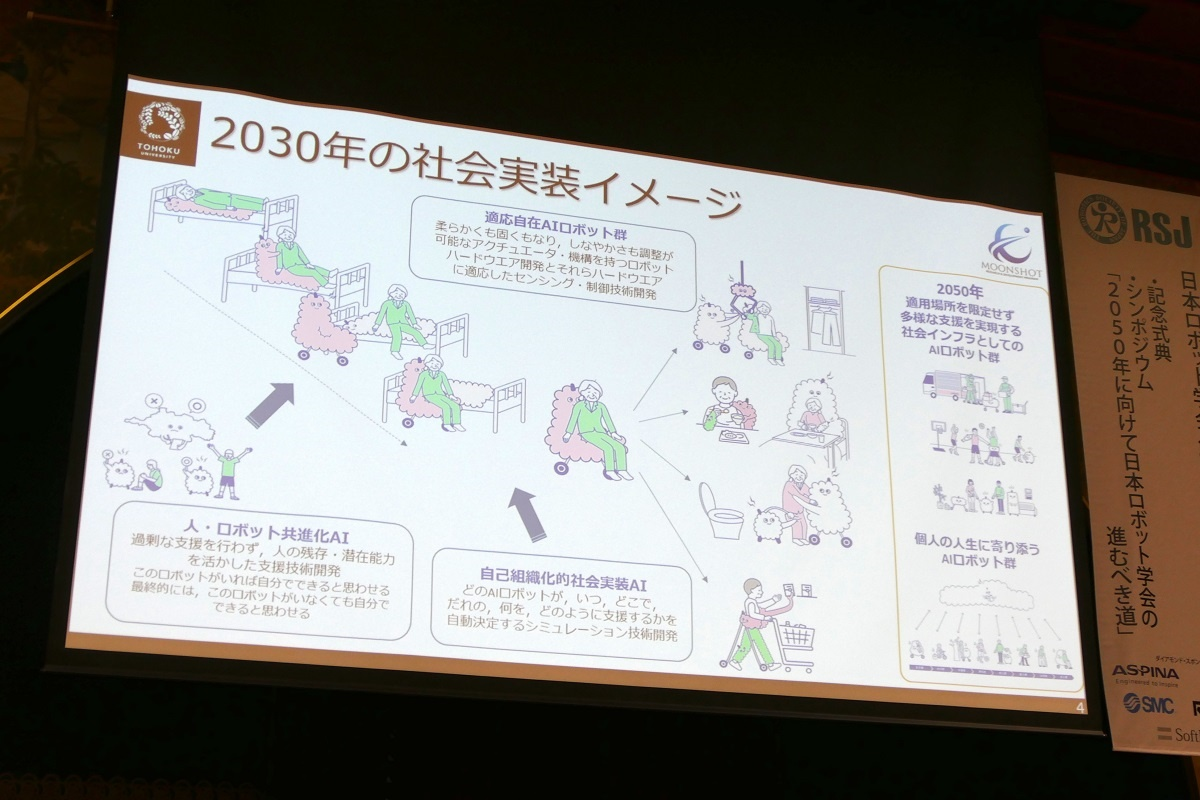 研究人机协作的东北大学的 Yasuhisa Hirata引用了金子美铃的“每个人都不一样,每个人都很好”,介绍了“更智能的包容社会”的理念。每个人的多样性构建了一个充满活力的社会。为此,一组机器人将提供适当的支持,例如社会形象。