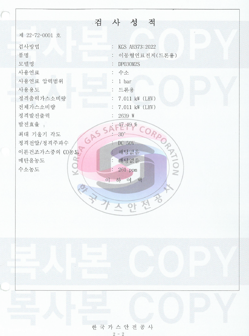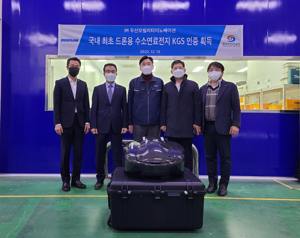 2021年2月,随着韩国有关培育氢能经济及氢能安全管理的法律的实施,法令规定的所有氢能用品从设计到生产阶段,必须通过法令规定的检查,才能销售和使用。但无论是韩国还是全球都没有用在航空或者航天的氢燃料电池系统的通用安全检查标准。DMI经过与韩国产业通商资源部、韩国燃气安全公社、产学研专家组的长期讨论,于2022年1月制定了无人机用燃料电池的安全性标准,斗山创新上半年上市的DP30M2S在制造设施、技术、检查等全过程中通过了KGS认证标准。