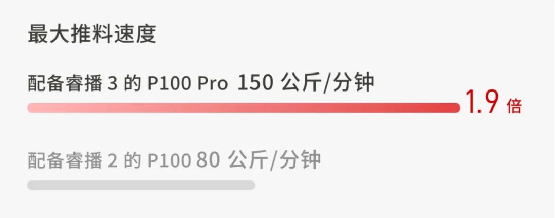 (需要注意的是:150 公斤/分钟最大推料速度是睿播 3 绞龙全速运转时的理论值,实际绞龙推料速度会受到实时余料量、颗粒种类/状态、料箱姿态等因素影响而有所差别。)除此之外,今年 P100 Pro/P100 2023 使用的是80 升超大料箱,纵深更大;双边加料口比前一代加大了 70% ,大大提升了使用便利性与加肥速度,两边同时加,省时又轻松。