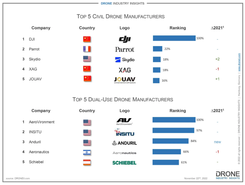 总部位于德国的研究公司Drone Industry Insights(Droneii)发布了年度旗舰报告,对制造无人机的公司进行了排名。研究小组评估了大约500家以制造无人机为核心业务的全球公司,并得出结论,世界顶级无人机制造商位于中国或美国。根据 DII 的报告,以下是 2022 年最好的无人机公司......