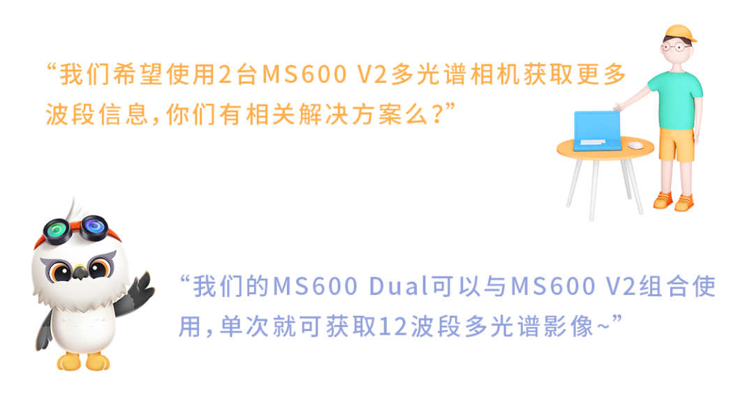 波段信息更丰富、产品使用更便捷、多遥感平台光谱信息更加统一,逐渐成为科研领域对航空多光谱数据应用的主要方向,为提升波段信息量,优化科研用户产品体验,便于天空一体化数据对比验证,MS600 Dual应运而生。