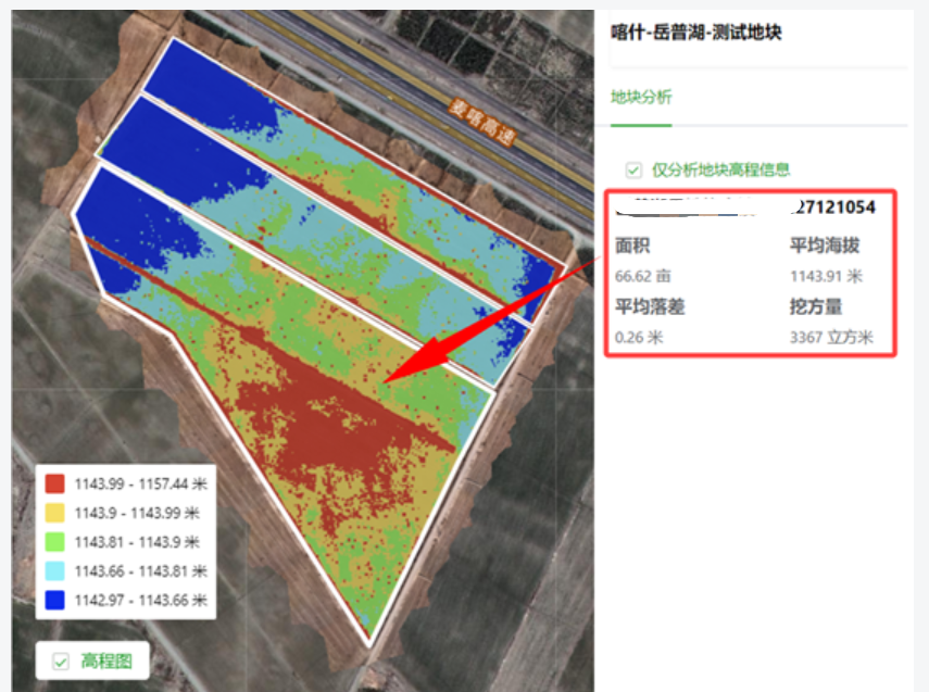 通过 M3M 结合大疆智慧农业平台生成高程分析图可以帮助种植户精准的看到土地平整效果。同时节省土地平整的费用。