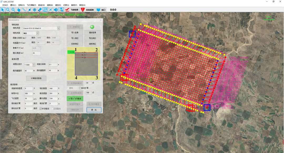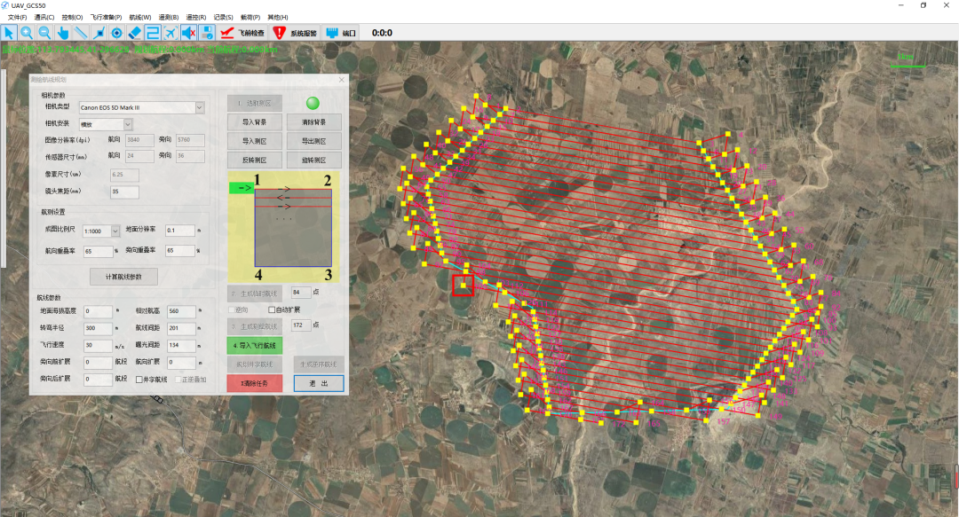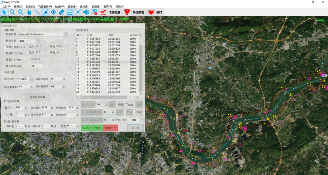 支持测绘航线(蛇形、井形)、巡线航线、起降航线的自动规划,内置多款相机模型,支持航线参数计算、不规则测区、转弯点插入、拍照点生成等多种自动化功能。