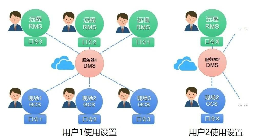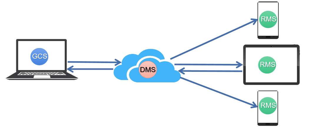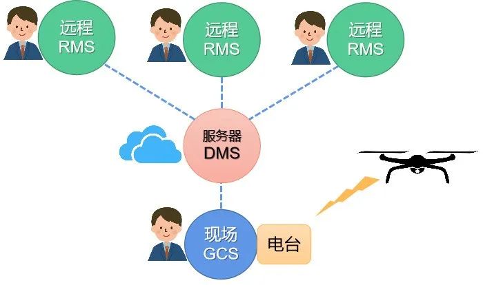 如图所示,RMS、DMS、GCS可以布置在互联网上,实现任意位置的互联互通;也可以布置在内部网上,在保证数据安全的同时实现多点飞行监控。