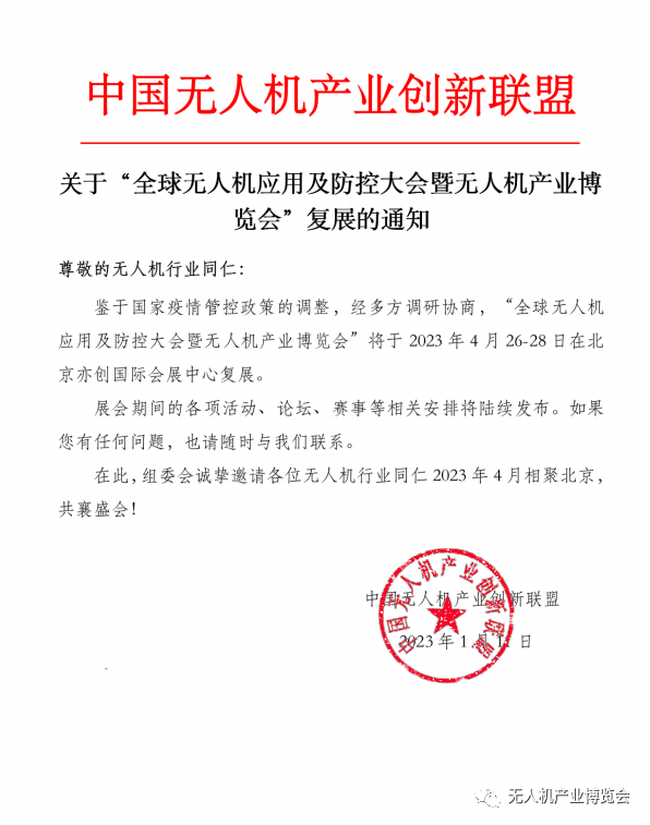 2023全球无人机大会是由中国光学工程学会、中国无人机产业创新联盟主办的目前国内高规格、高水平的无人机产业应用国际盛会。大会设有30余场无人机行业巅峰会议、2万平米展览、1个国内顶级无人机大赛,汇聚了来自全球20多个国家和地区高校、科研院所、领先企业的百余位无人机领域专家与企业家代表。致力于助推国内无人机产业健康、有效发展,加强无人机区域国际交流合作,探索国际无人机产业创新发展之路。
