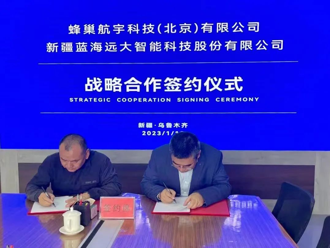 2023年1月12日,蜂巢航宇科技(北京)有限公司与新疆蓝海远大智能科技股份有限公司(以下简称“新疆蓝海远大”)进行座谈交流会议,并签署了战略合作协议。双方将依托各自优势资源,打造牢固的战略合作伙伴关系,实现技术对接与产品融合,整体合作共赢,共同发展,在国内市场融合集成,国际贸易等领域进行深度产业合作,共同开拓国内外无人机市场。
