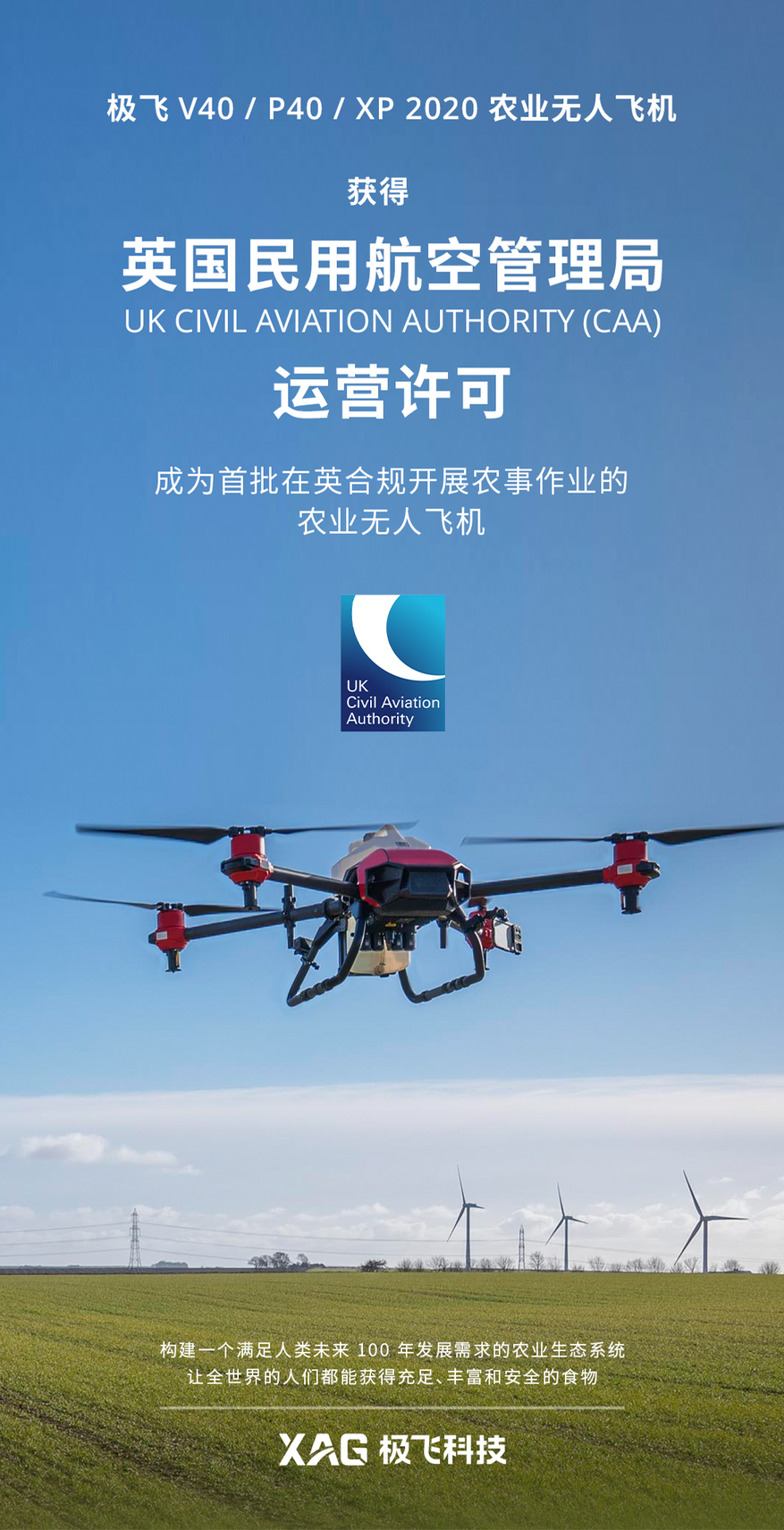 近日,极飞 V40、P40、XP 2020 农业无人飞机获得英国民用航空管理局(Civil Aviation Authority,简称 CAA)的运营许可,成为首批在英合规开展农事作业的农业无人飞机,这也是英国 CAA 首次把运营许可授予全自主飞行、用于喷洒及播撒作业的农业无人飞机。