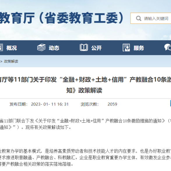 为充分发挥企业的重要办学主体作用,促进人才培养供给侧和产业需求侧结构要素融合,作为全国首个省份,1月10日,山东11部门联合下发《关于印发“金融+财政+土地+信用”产教融合10条激励措施的通知》(鲁教职字〔2023〕1号),发布产教融合10条激励支持政策。