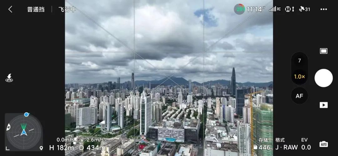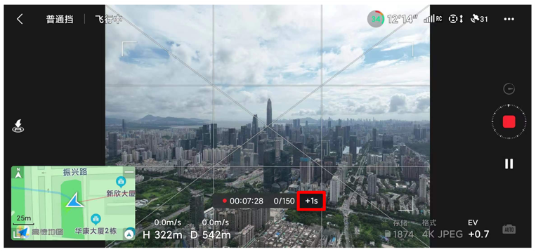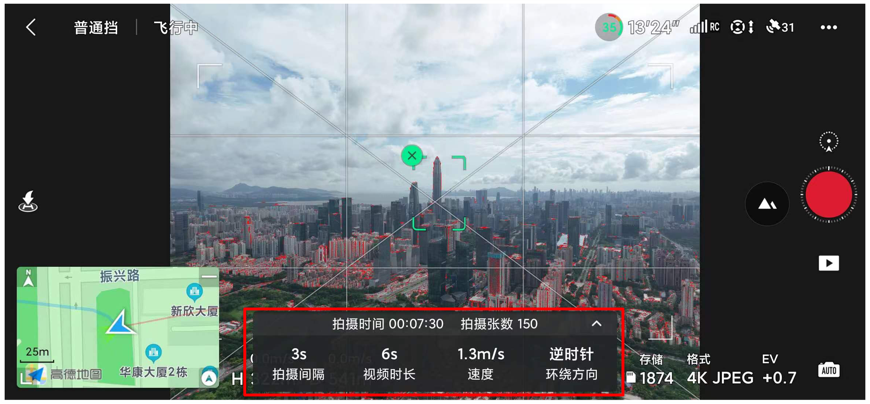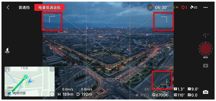 5、取景框:拍摄完成后无人机将自动合成延时摄影视频并增稳,增稳方式是要为电子裁切,为了避免成片主体不完整等问题,建议在取景框内进行构图;