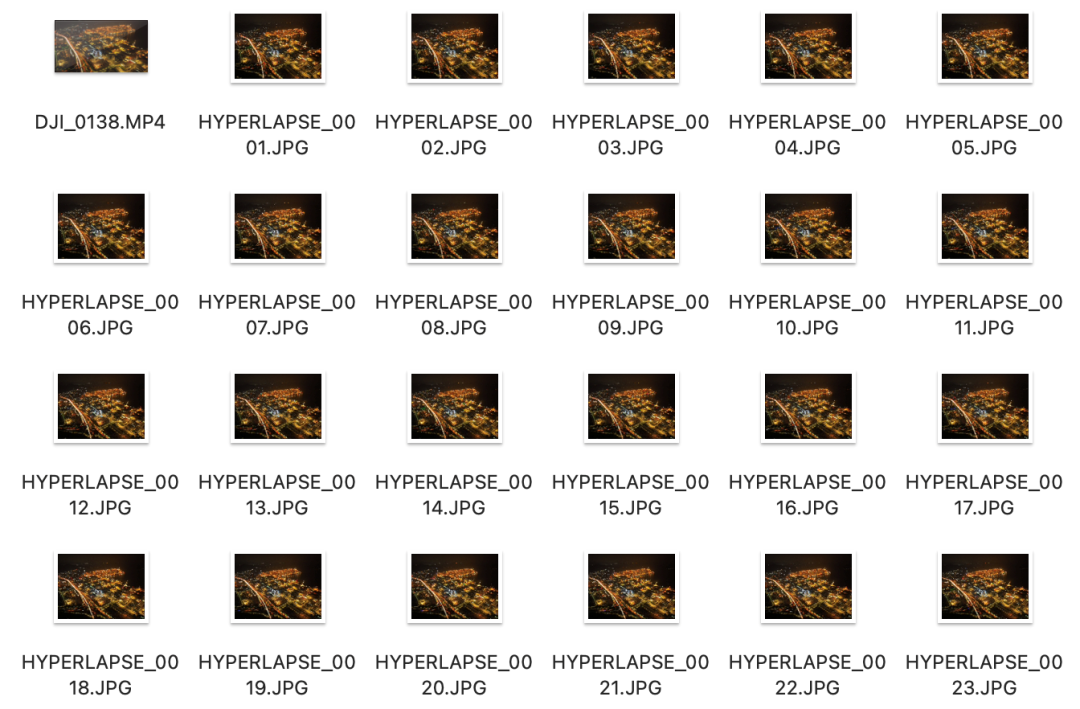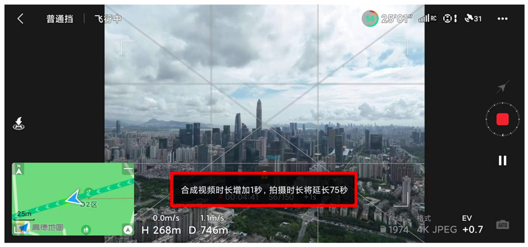 而一段时间内,以相同的间隔时间拍摄一定数量的静止图像,然后以一定的帧数播放,就得到了一段延时摄影视频,大疆无人机自动合成的帧速率为25FPS,所以延时模式每拍摄 25 张照片即可生成1秒延时视频。