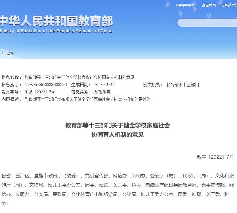 教育部等十三部门关于健全学校家庭社会协同育人机制的意见
