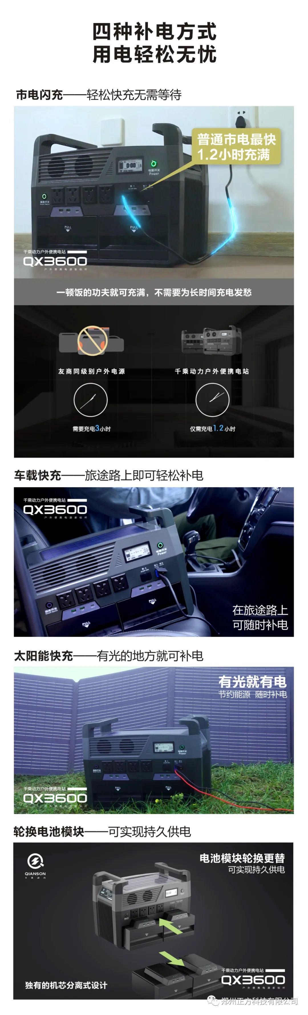 作为18年来一直致力于“智能锂电池模组/锂电池BMS管理系统整体研发、智能制造及销售”的高新技术企业,正方科技此次展出的是旗下推出的储能新品—千乘动力QX3600新能源便携电站。这款电站是正方科技专为热爱户外生活的旅游达人和家庭停电备用储能电源而打造的。