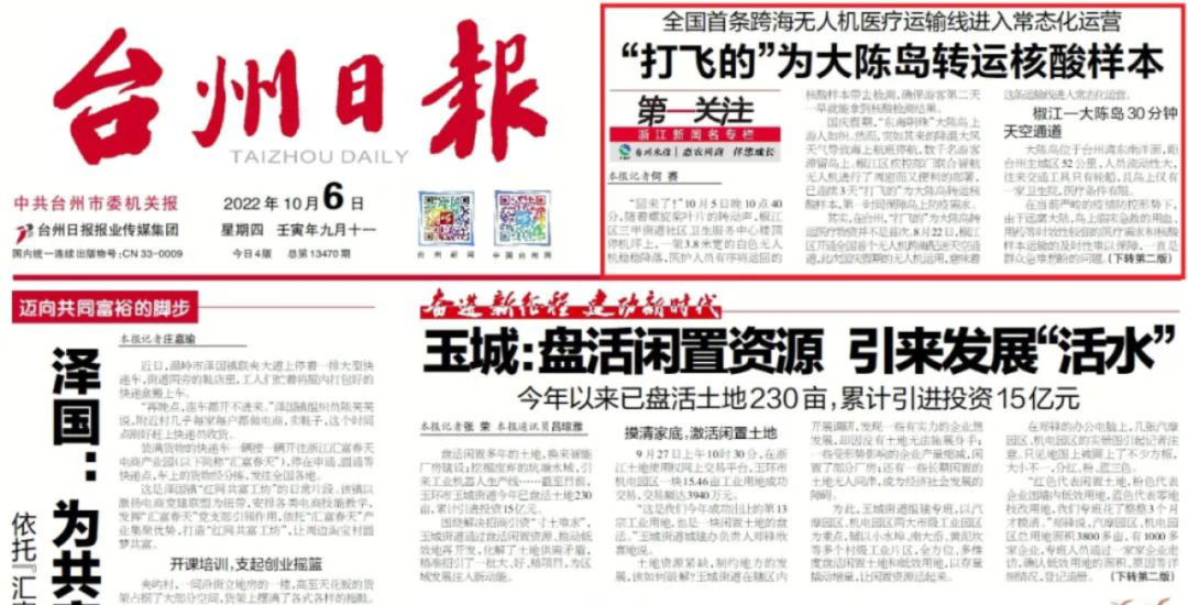 2022年国庆期间,浙江省台州市椒江区大陈岛跨海无人机医疗运输进入常态化运营,大陈岛每天接待带数万游客;智航无人机V380Pro每天将1500份核酸样本从岛上运至台州疾控中心检测,对于岛上疫情防控起到重大作用。