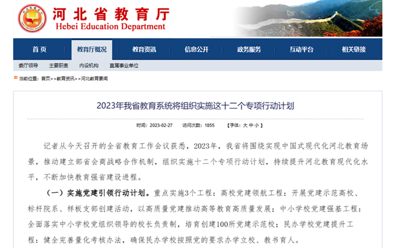 近日,河北省召开2023年全省教育工作会议,明确在全省教育系统深入学习贯彻党的二十大精神,推动建立部省会商战略合作机制,组织实施十二个专项行动计划。会议提出: