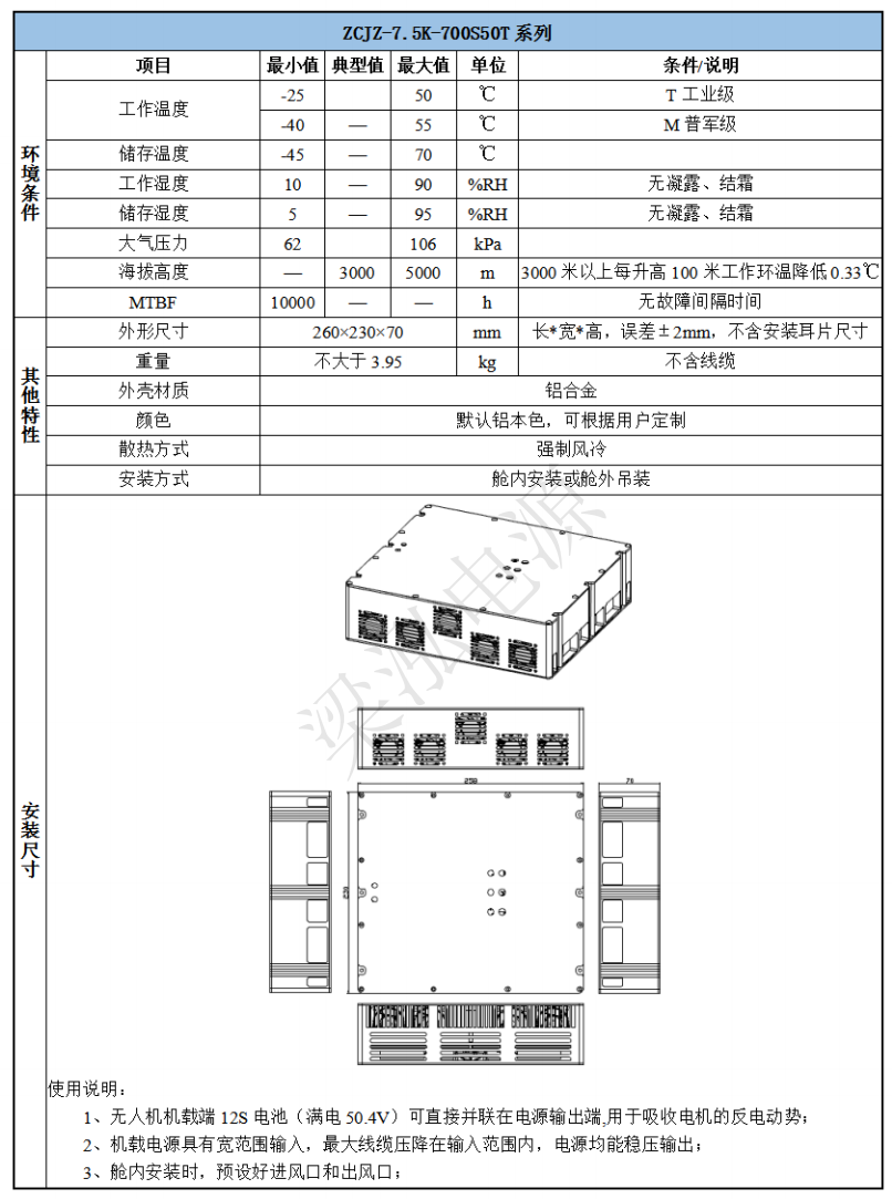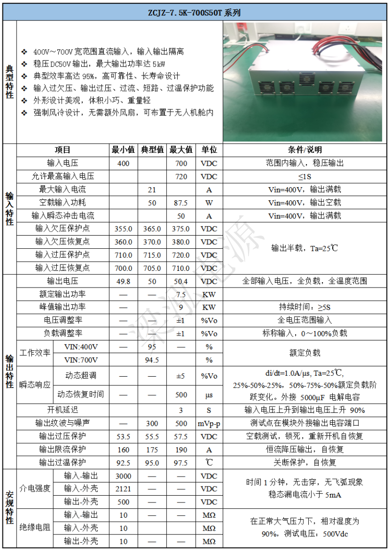 机载电源7.5KW,输入400-700Vdc,输出49.5Vdc,满足起飞重量约35kg左右的12S无人机