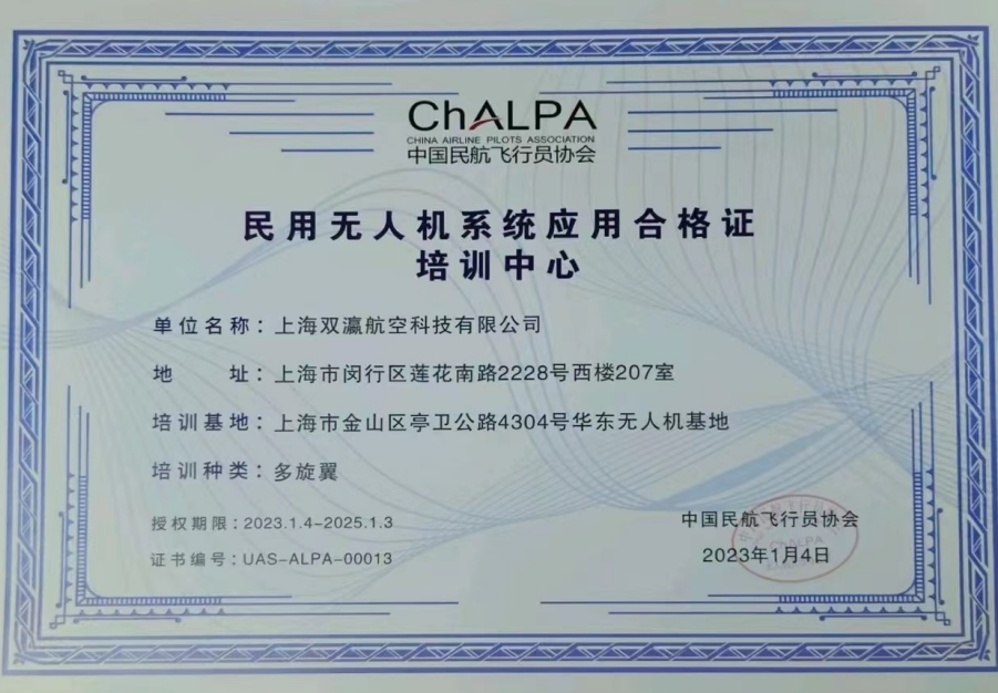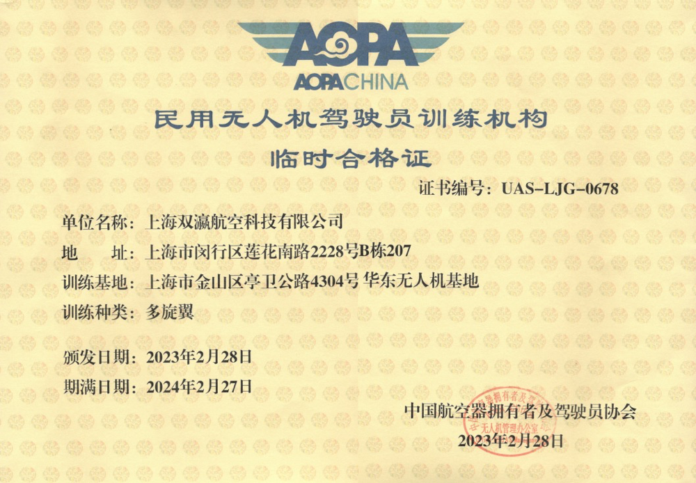双瀛航空于2023年获得ALPA民用无人机系统应用合格证培训中心、aopa民用无人机驾驶员训练机构合格证培训资质,正式成立“双瀛航空培训学院”,开启无人机教育培训。