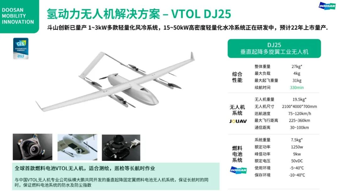 斗山创新氢动力复合翼无人机DJ25 (纵横股份合作机型) 作为全球首款实用量产型氢动力复合翼无人机,续航时间长达5.5小时,续航距离可达450公里以上,在长距离视频监控应用,长时间的滞空通信中继等具有优势。