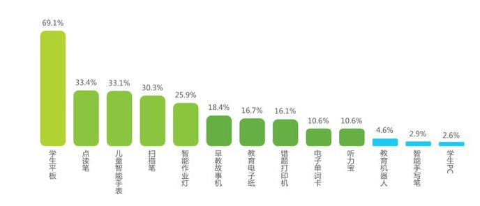 在教育智能硬件产品的类别选择上,学生平板最受家长欢迎,约七成家长选择购买学生平板;其次是点读笔、儿童智能手表、扫描笔及智能作业灯,约三成左右的家长购买过。
