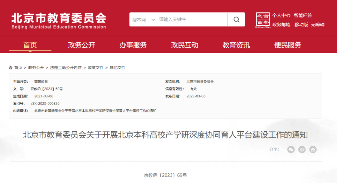 北京市教委发布开展北京本科高校产学研深度协同育人平台建设工作的通知