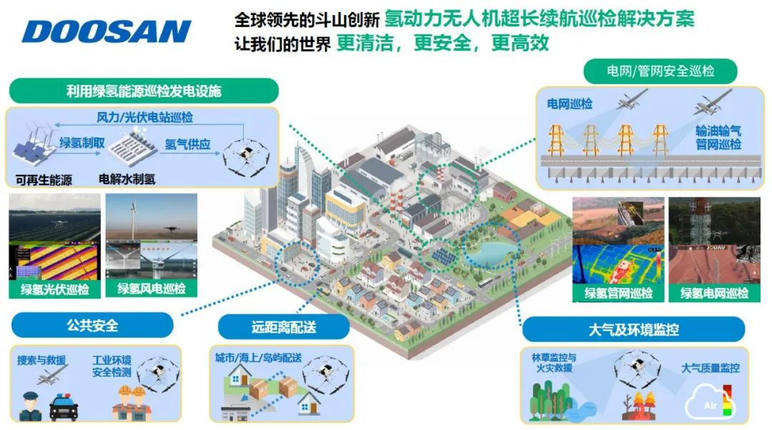 斗山创新基于输电电网以及风电巡检的需求,2018年以后先后与合作企业深圳科卫泰开发了用于精细巡检的氢动力旋翼无人机DT30N,续航时间可达148分钟,续航距离可达60公里。同时为了满足长距离的管网及电网的巡检,与纵横股份开发了氢电混动复合翼无人机DJ25,续航时间可达330分钟,续航距离可达450公里。两款无人机均选用了斗山创新开发的氢动力系统,不仅增加了续航时间大大提供了工作效率。产品在飞行过程中只排出水,也实现了减碳减排的效果,为实现双碳目标做出贡献。