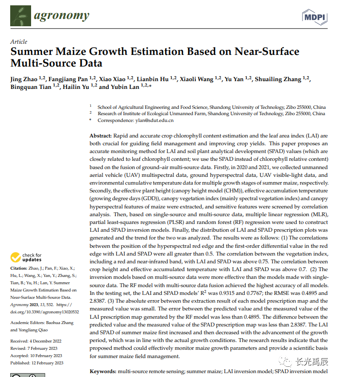 山东理工大学农业工程与食品科学学院兰玉彬团队在Agronomy发表了题为“Summer Maize Growth Estimation Based on Near-Surface Multi-Source Data”的研究论文。