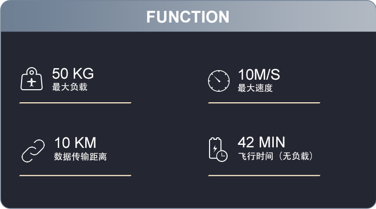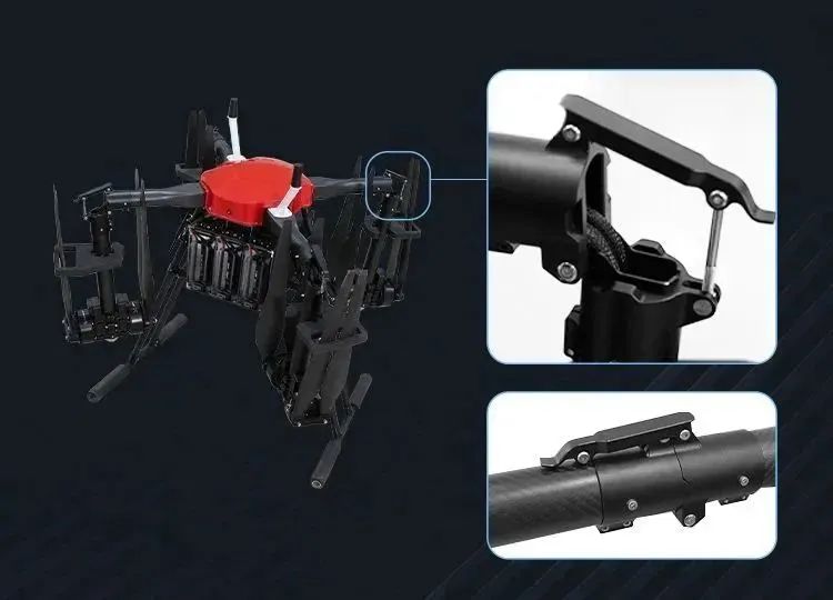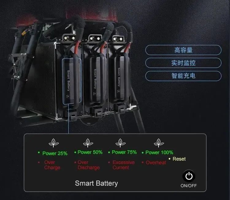 采用3块16S 30000mAh智能电池,当携带50kg的负载时,可飞行18分钟。这些电池具有高容量、实时监测和智能充电等优点,能够为无人机提供稳定、可靠的电力支持,同时保障电池的安全性和寿命。