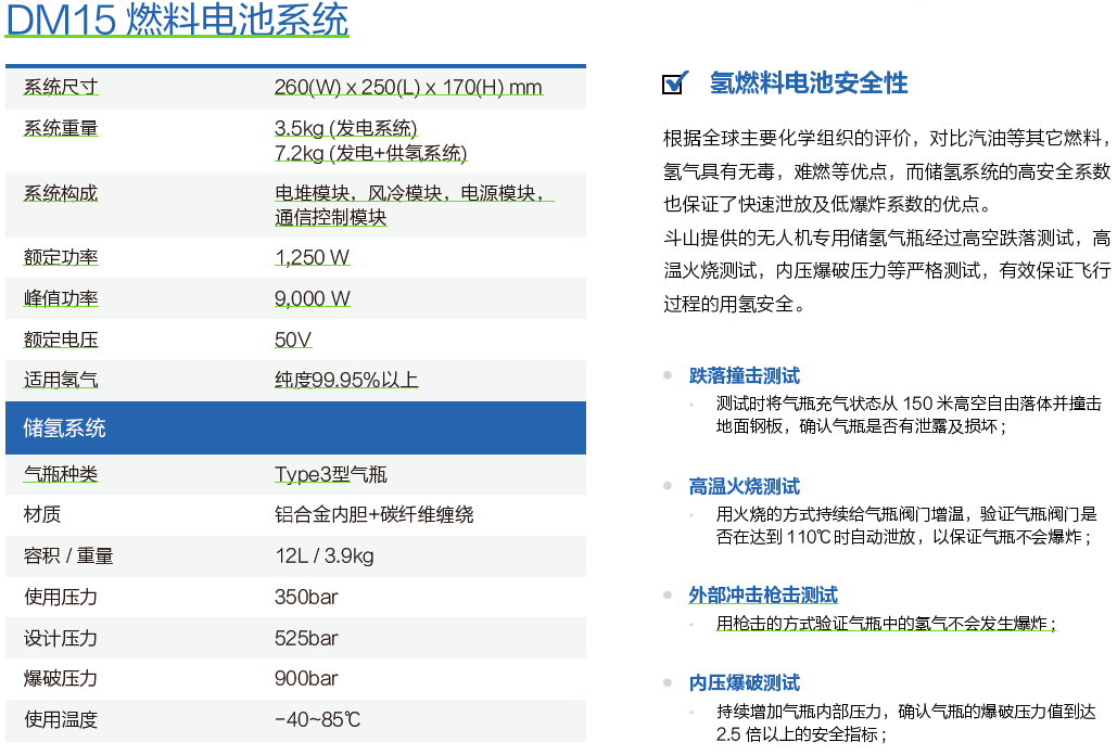产品使用斗山创新轻量化空冷型DM15 燃料电池系统,实现了电堆发电模块、高压储氢模块和电源管理模块的一体化设计,通过高品质的硬件以及系统化的软件控制,使飞行平台系统的稳定性及效率性处于领先地位。