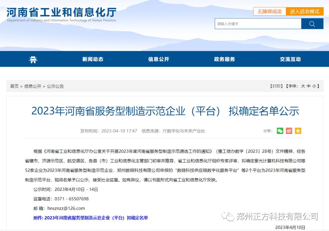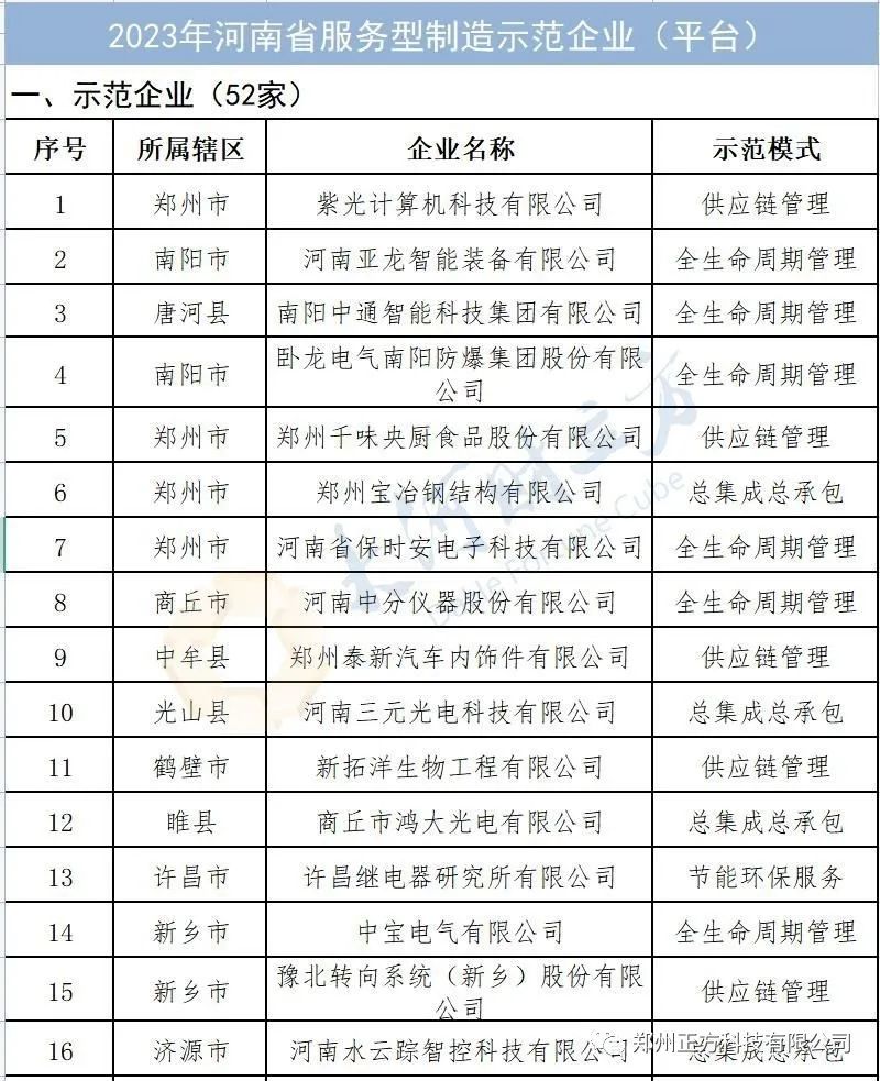 根据《河南省工业和信息化厅办公室关于开展2023年度河南省服务型制造示范遴选工作的通知》(豫工信办数字〔2023〕28号)文件精神,经各省辖市、济源示范区、航空港区、各县(市)工业和信息化主管部门初审并推荐,省工业和信息化厅组织专家评审,拟确定52家企业为2023年河南省服务型制造示范企业,2个平台为2023年河南省服务型制造示范平台。其中就包括正方科技公司。